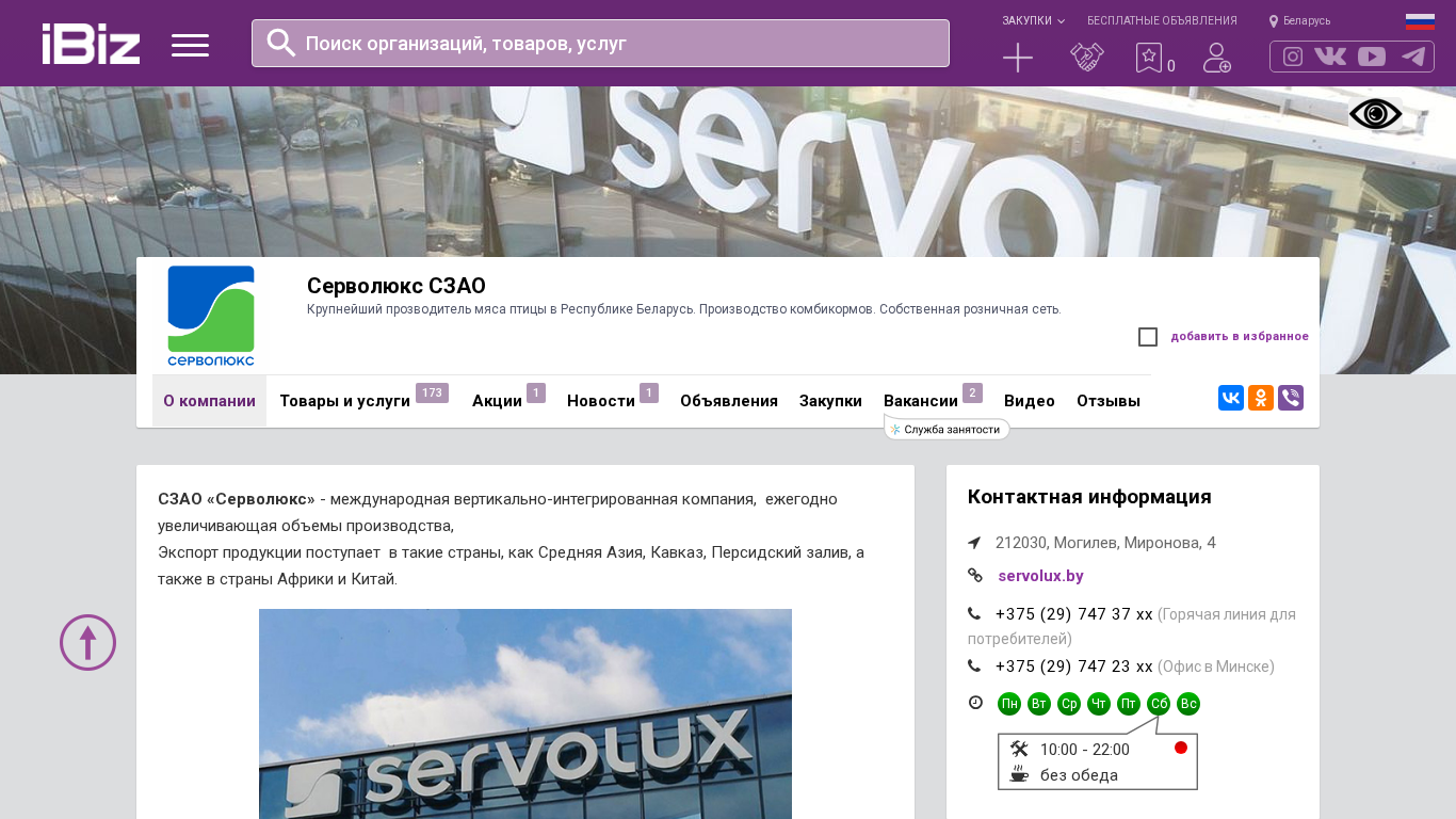 | Название / Заголовок | Серволюкс СЗАО - Крупнейший прозводитель мяса птицы в Республике Беларусь. Производство комбикормов. Собственная розничная сеть.. 212030, Могилев, , Миронова, 4 |
