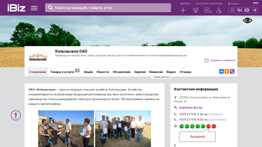 | AI-анализ | This website is for the agricultural company "OAO Kopylskoe" based in Belarus. The company specializes in the production of milk, meat, grain, sugar beets, and rapeseed. It also has its own meat processing plant. The address is given as 223920, Tymkovichi ag., Novaya, 41. The website includes sections for farm news, products and services, and contact information. Keywords associated with the website include farming, livestock, meat processing, and agricultural production. |
