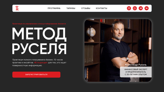 | AI-анализ | The portal "Метод Руселя" (Russell.by) is a business training program that offers a three-day practical course for confident public speaking, business idea selling, and goal achievement. The website targets individuals who struggle with business strategy development, team recruitment, financial management, and predicting revenues. The program is suitable for both beginners and established business owners dealing with cash flow issues, high stress levels, and dependency on their own decision-making. After completing the program, participants will digitize their businesses, establish a transparent reporting system, identify and eliminate financial losses, find growth opportunities, and create a development plan. The training covers financial analysis techniques, debt management, client communication, and ways to increase personal income. The program also addresses strategies for exiting the operational phase and managing a business without constant owner control. The website offers detailed information on the company's actions for increasing revenue and provides insights into client |