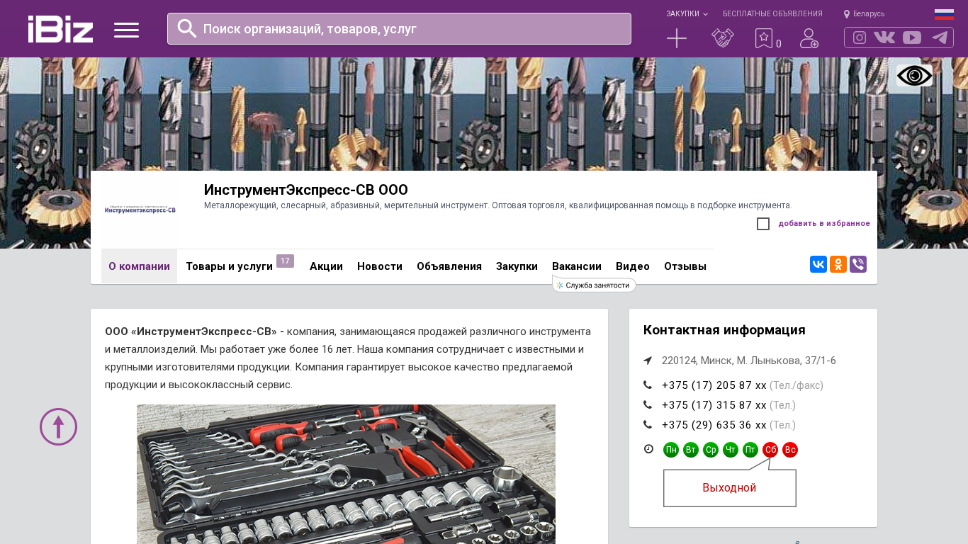 | Название / Заголовок | ИнструментЭкспресс-СВ ООО - Металлорежущий, слесарный, абразивный, мерительный инструмент. Оптовая торговля, квалифицированная помощь в подборке инструмента.. 220124, Минск, М. Лынькова, 37/1-6 |