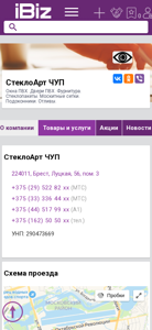 | AI-анализ | The website is a business platform for SteклоArt CHUP, offering windows and doors made of PVC, fittings, glass packages, mosquito nets, and podoconikis (baseboards). The company's contact information, including phone numbers and address, is provided, along with a map scheme for navigation. Keywords associated with the company include "aluminum profile systems," "PVC doors between rooms," "production and installation of plastic windows," "buying PVC windows," "buying castings," "buying baseboards," "window lamination," "metallic entrance doors for apartments," "mosquito nets for windows," "PVC window manufacturer," "glass balustrades and loggias," "production of interroom doors," "production of PVC windows," "production of glass packages," and "glass balustrades production." The company can be found in Brest |