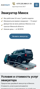 | AI-анализ | The web project Avto Help24 offers affordable and quick evactor services in Minsk and the surrounding regions. The phone number for the service is +375 (29) 888-21-34, available 24/7. The company provides services for various vehicle types and offers transparent pricing without additional fees. The evactor services include: evactor for light vehicles starting from 90 BYN, evactor for SUVs, minivans, and light trucks up to 3 tons for 100 BYN, evactor for heavy trucks for 100 BYN, covered evactor for 100 BYN, evactor after accidents for 100 BYN, sober driver for 100 BYN, evactor manipulator for 100 BYN, evactor with partial loading for 100 BYN, fuel |