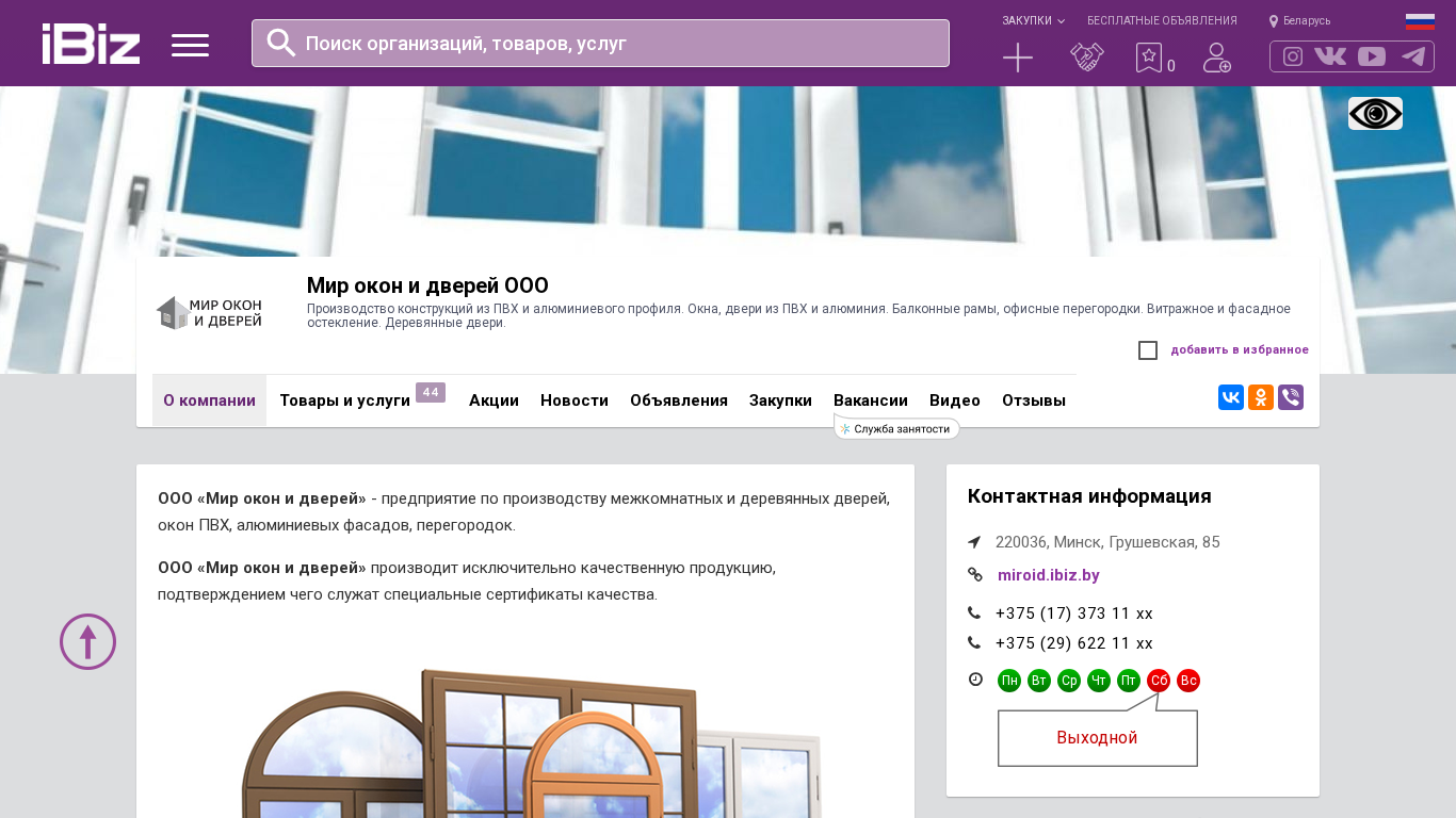| Название / Заголовок | Мир окон и дверей ООО - Производство конструкций из ПВХ и алюминиевого профиля. Окна, двери из ПВХ и алюминия. Балконные рамы, офисные перегородки. Витражное и фасадное остекление. Деревянные двери.. 220036, Минск, , Грушевская, 85 |