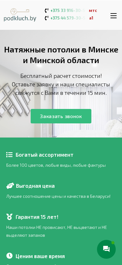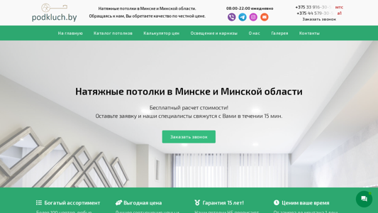 | AI-анализ | --- The portal podkluch.by offers suspended ceilings in Minsk and the Minsk region. Customers gain quality at honest prices by approaching the company. Business hours are from 08:00 to 22:00 daily. The catalog presents a range of over 100 colors in various types and textures, ensuring a good price-quality ratio in Belarus, with a 15-year guarantee. The website includes a calculator for prices, a section on lighting and carpentry, an about us page, a gallery, and contacts. Customers can place an order and request a callback. The company offers a wide selection of matte, glossy, and satin textures, with the latter being a smooth, non-reflective surface that harmonizes with wall and floor finishes. |