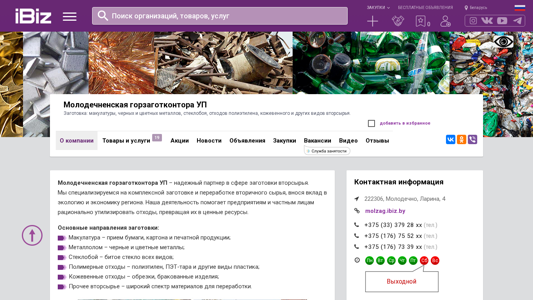 | Название / Заголовок | Молодечненская горзаготконтора УП - Заготовка: макулатуры, черных и цветных металлов, стеклобоя, отходов полиэтилена, кожевенного и других видов вторсырья.. 222306, Молодечно, , Ларина, 4 |
