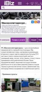 | AI-анализ | The website is for Minskkoopvtorresursy Unitarnoe Predpriyatie - Sbor (Zagotovka) Vtorichnykh Materialnyh Resursov Ot Fizicheskih Lic, which translates to "Minsk Cooperative Resources Enterprise - Collection (Procurement) of Secondary Material Resources from Physical Persons: Paper and Cardboard Waste, Glass Waste (Glass Scrap), Black and Color Metals, Polyethylene, PET Bottles, and Accumulator Batteries." The company is located in Minsk, Belarus, at the address Glagoleva, 39. The website provides information on the types of waste materials accepted for procurement, as well as contact details and addresses of collection points for each district in Minsk. The company specializes in the collection, sorting, |