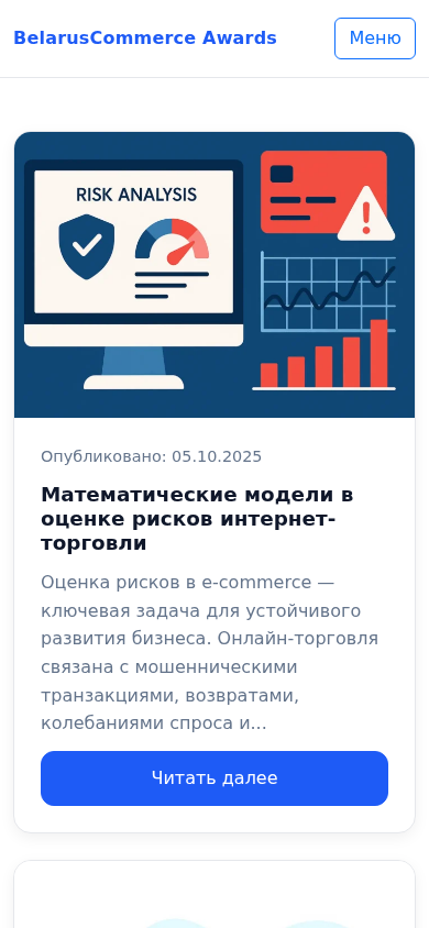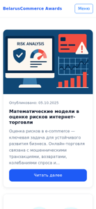 | AI-анализ | The portal BelarusCommerce Awards is a website dedicated to recognizing and evaluating the best solutions in e-commerce, logistics, marketing, and technologies in Belarus. It features expert advice, analytics, and research, as well as ratings of internet shops. The site provides information on risk management in e-commerce, optimization of delivery logistics, warehouse management systems for e-commerce projects, and email marketing strategies. It also includes articles on the psychology of online shopping and the integration of CRM systems with online stores. The website contains articles published on topics such as e-commerce risk assessment, optimization of delivery logistics, warehouse management systems for e-commerce projects, email marketing strategies, the psychology of online shopping, and the integration of CRM systems with online stores. It includes expert opinions, analytics, and research, as well as ratings of internet shops. The contact information for the website is provided, including an email address and |