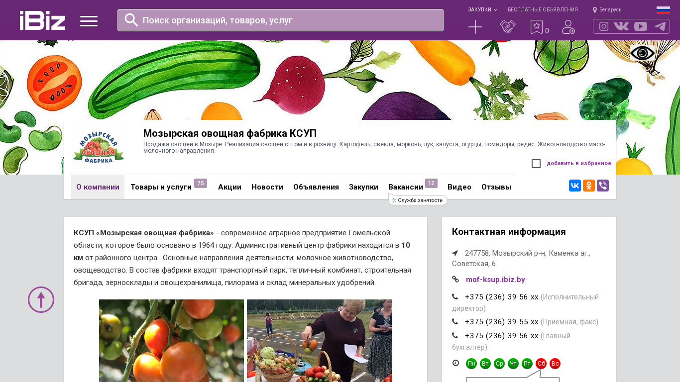 | Название / Заголовок | Мозырская овощная фабрика КСУП - Продажа овощей в Мозыре. Реализация овощей оптом и в розницу. Картофель, свекла, морковь, лук, капуста, огурцы, помидоры, редис. Животноводство мясо-молочного направления.. 247758, , Каменка аг., Советская, 6 |