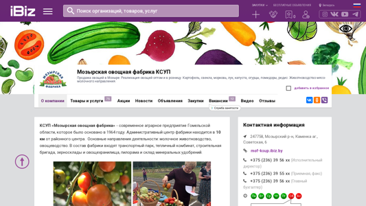 | AI-анализ | The web project "Mozirskaya ovochnaya fabrika KSUP" is a modern agricultural enterprise in the Homiel Oblast of Belarus, established in 1964. Its administrative center is located 10 km from the district center. The main areas of activity are dairy livestock farming and vegetable farming. The farm includes a transport park, greenhouse complex, construction brigade, grain silos and vegetable storage facilities, a sawmill and a fertilizer storage, producing and selling: tomatoes; cucumbers; carrots; white cabbage; beets; onions; peppers; radish; squash; watermelon; potatoes; grains; rapeseed; compound feed; milk; beef. Besides cultivating commercial crops and vegetables, the farm grows feed crops for the livestock industry. Major buyers include: ChUPP " |