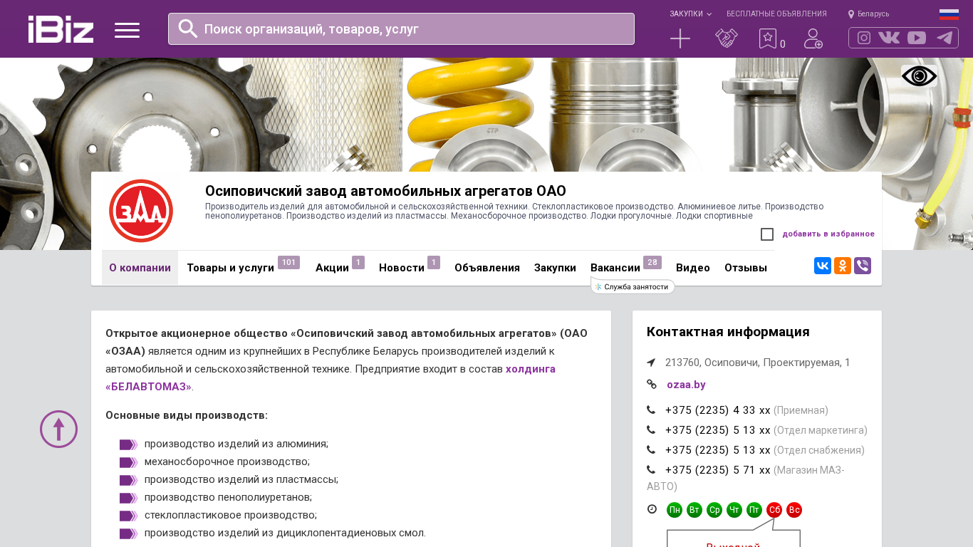 | AI-анализ | language: ru The web project "Osiповичский завод автомобильных агрегатов OAO" is a major producer of items for automotive and agricultural technology in Belarus. It is part of the Belavtomaz holding company. The main production areas include aluminum products, mechanical assembly, plastic items, polyurethane foam, and glass-plastic production. The variety of production methods and technologies enables the company to offer a wide range of products. Major clients include MAZ, MZKT, BELAZ, MTZ, Gomselmash, Ukkh BKM, Taim, Amkodor, and RUP BPovts. The website provides information on the company, its products and services, as well as contact details and a location map. |