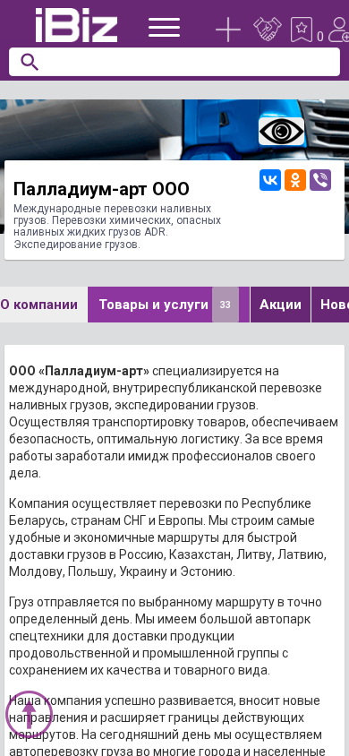 | AI-анализ | --- This website belongs to OOO Palladium-art, a company based in Мозырь, Belarus, with the address 1-й Малинина пер., 9. The main focus of the business is on international and domestic transport of bulk goods, as well as expediting shipments. The company specializes in handling hazardous and chemical liquid cargo in accordance with ADR regulations. The website provides information on the company's location, contact numbers, and services. OOO Palladium-art operates in Belarus and countries within the CIS and Europe, offering efficient and economical shipping routes for quick cargo delivery to Russia, Kazakhstan, Lithuania, Latvia, Moldova, Poland, Ukraine, and Estonia. The company has a large fleet of specialized vehicles for transporting food and industrial products while maintaining their quality and appearance. OOO Palladium-art |