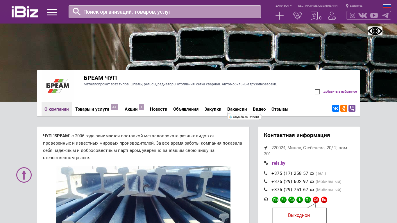 | AI-анализ | The website is a business platform for Chup BREAM, a metal processing company located in Minsk, Belarus. The company specializes in the production and sale of various types of metal products, including rails, beams, metal sheets, radiators for heating, and solder mesh. Additionally, they offer trucking services. The website provides a map for directions, contact information, and the company's address at 220024, Stebeneva, 20/2, office 301. The company's name, "BREAM CHUP," has been in operation since 2006, supplying metal products from reputable international manufacturers. They pride themselves on being a reliable and trustworthy business partner, serving major industries and production sites. With their own storage facilities, a skilled and experienced workforce, transportation fleet, and modern equipment, they are able |