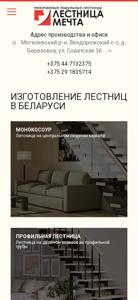 | AI-анализ | This online resource is dedicated to the production and sale of custom-made wooden and metal staircases in Belarus. The largest producer in the country, it offers vintoon and marching staircases. The address of the production and office is in the Mogilev region, Vendrozhsky district, village of Berezovka, Sovietskaya 36. The phone numbers provided are +375 44 7132375 and +375 29 1835714. The company specializes in manufacturing staircases on metal frames with wooden steps, and produces various types including those on monocoque, with a central welded frame, and vintoon with PVC handrails and wooden supports. They also offer staircases without a supporting frame on large bolts and compact guiding stairs. The company's product range includes vintoon |