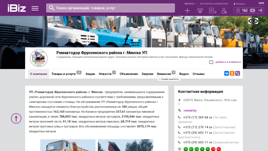 | Название / Заголовок | Ремавтодор Фрунзенского района г. Минска УП - Содержание, текущий и капитальный ремонт дорог. Оказание платных автотранспортных услуг населению. Аренда строительной техники.. 220073, Минск, , Ольшевского, 18/б, ком. 1 |