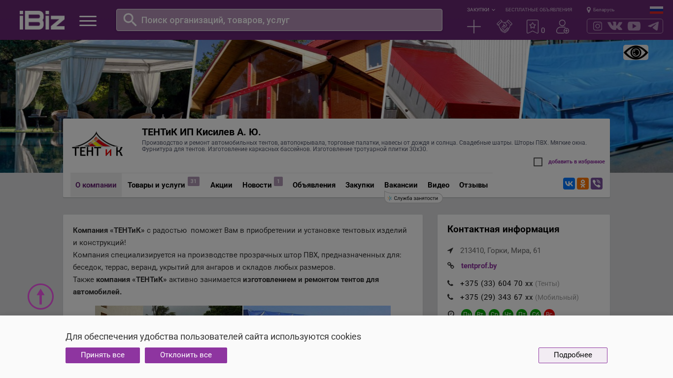 | AI-анализ | The website is for a Belarusian business called ТЕНТиК, which is owned by A. Yu. Kisilev and is located in Gorki, Mir, 61. The company specializes in the production and repair of automobile tents, car covers, trade pavilions, rain and sun shelters, wedding tents, PVC curtains, soft windows, tent furniture, and the manufacture of carousel bases and 30x30 cm concrete paving. The website provides a scheme for reaching the company, contact telephone numbers, and the company's address. The site is categorized under the "Tents, covers, shelters, and metal structures" section, and features 31 listings for various tent-related products and services. The company offers consulting and installation services for its tent products. The company's expertise includes the production of PVC |