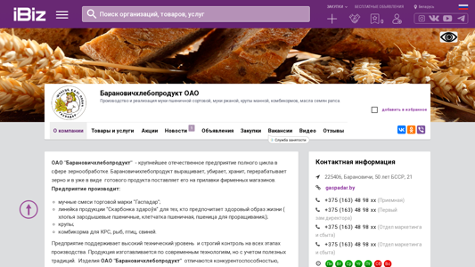 | AI-анализ | The web project "Baranovichhleboprodukt OAO" is a Belarusian company specializing in the production and sale of various types of flour, rye flour, buckwheat, feeds, and rapeseed oil. The company is located in Baranovichi, Belarus, and has been in operation for 50 years. The website provides information on the company, its products and services, and includes sections for news, vacancies, and announcements for purchases. Products include a line of healthy offerings under the "Scarbona zdravya" brand, as well as bread and pasta mixes under the "Gaspadar" brand. The company also produces feed for cattle, fish, birds, and swine. The website includes a map for directions to the company and contact information. |