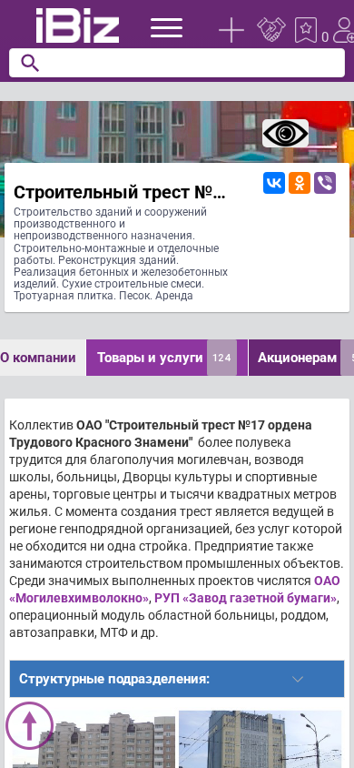 | Название / Заголовок | Строительный трест №17 ордена Трудового Красного Знамени ОАО - Строительство зданий и сооружений производственного и непроизводственного назначения. Строительно-монтажные и отделочные работы. Реконструкция зданий. Реализация бетонных и железобетонных изделий. Сухие строительные смеси. Тротуарная плитка. Песок. Аренда. 212002, Могилев, , Непокорённых бульвар, 28 |