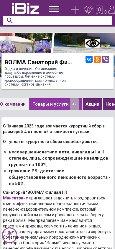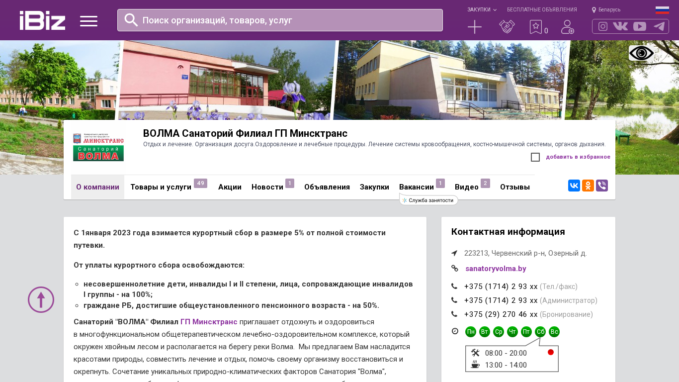 | AI-анализ | The portal Volma Sanatorium Filial of Minskttrans - Rest and Treatment. Entertainment and health services. Treatment of the circulatory, bone-muscle, respiratory systems. 223213, Oserny d., Belarus. This website is for the Volma Sanatorium Filial of Minskttrans, which offers rest and treatment, entertainment, and health services. The focus is on the treatment of the circulatory, bone-muscle, and respiratory systems. The sanatorium is located in Oserny d., Belarus, and provides a scheme for travel, contact phone numbers, and the address of the company. From January 2023, a resort fee of 5% is charged on the full price of the voucher. Exemptions from the resort fee include children under age, persons with disabilities I |