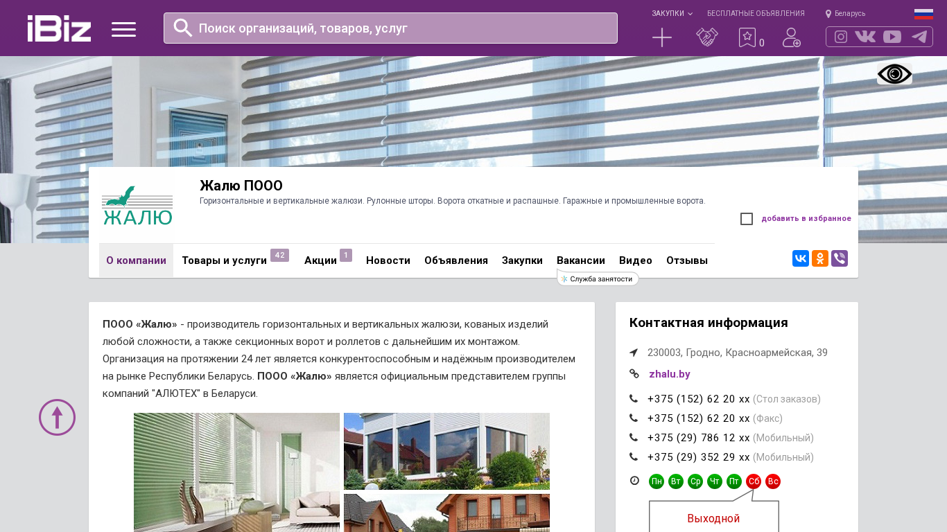 | Название / Заголовок | Жалю ПООО - Горизонтальные и вертикальные жалюзи. Рулонные шторы. Ворота откатные и распашные. Гаражные и промышленные ворота.. 230003, Гродно, Красноармейская, 39 |