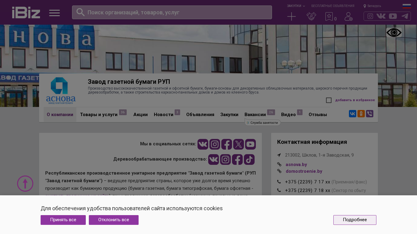 | Название / Заголовок | Завод газетной бумаги РУП - Производство высококачественной газетной и офсетной бумаги, бумаги-основы для декоративных облицовочных материалов, широкого перечня продукции деревообработки, а также строительства каркасно-панельных домов и домов из клееного бруса.. 213002, Шклов, , 1-я Заводская, 9 |