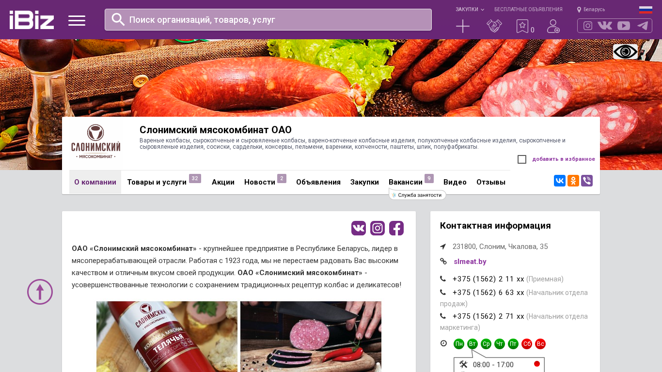 | Название / Заголовок | Слонимский мясокомбинат ОАО - Вареные колбасы, сырокопченые и сыровяленые колбасы, варено-копченые колбасные изделия, полукопченые колбасные изделия, сырокопченые и сыровяленые изделия, сосиски, сардельки, консервы, пельмени, вареники, копчености, паштеты, шпик, полуфабрикаты.. 231800, Слоним, , Чкалова, 35 |