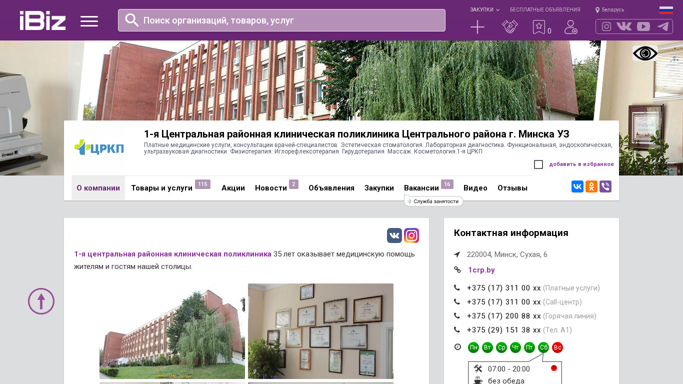 Название / Заголовок | 1-я Центральная районная клиническая поликлиника Центрального района г. Минска УЗ - Платные медицинские услуги, консультации врачей-специалистов. Эстетическая стоматология. Лабораторная диагностика. Функциональная, эндоскопическая, ультразвуковая диагностики. Физиотерапия. Иглорефлексотерапия. Гирудотерапия. Массаж. Косметология.1-я ЦРКП. 220004, Минск, , Сухая, 6 |