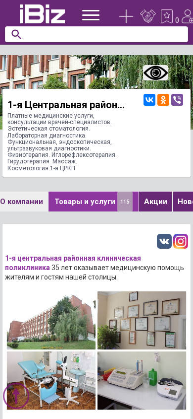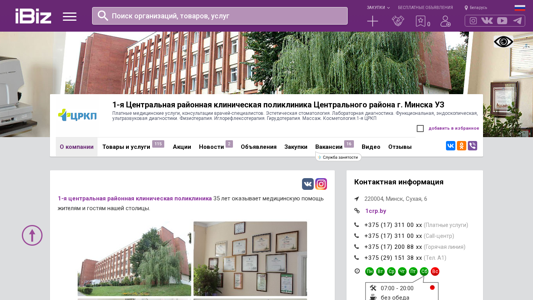 AI-анализ | --- The web project 1-я Центральная районная клиническая поликлиника Центрального района г. Минска UZ is a paid medical services clinic offering consultations from specialist doctors, aesthetic dentistry, laboratory diagnostics, functional, endoscopic, and ultrasound diagnostics, physiotherapy, acupuncture, hydrotherapy, massage, and cosmetology services. The clinic, located at 220004, Sukhaia Street, 6 in Minsk, Belarus, provides various medical services for residents and visitors. |