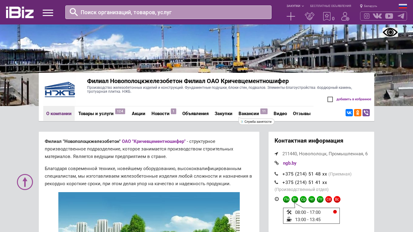 favicon Филиал Новополоцкжелезобетон Филиал ОАО Кричевцементношифер - Производство железобетонных изделий и конструкций. Фундаментные подушки, блоки стен, подвалов. Элементы благоустройства: бордюрный камень, тротуарная плитка. НЖБ.. 211440, Новополоцк, , Промышленная, 6