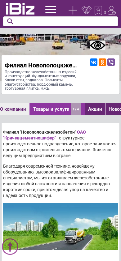 The website is for Filial Novopolotskzhbeтон, a branch of OAO Krichevcementnoshifer, specializing in the production of reinforced concrete products and structures. The offered items include foundation pads, wall blocks, and basement constructions, as well as elements of landscaping such as border stone and paving stones. The branch is located in Novopolotsk, Belarus, on Industrial Street, number 6. The website provides no further contact or location details. The company's main offerings include various types of reinforced concrete structures and building materials, with a focus on quality and efficiency.