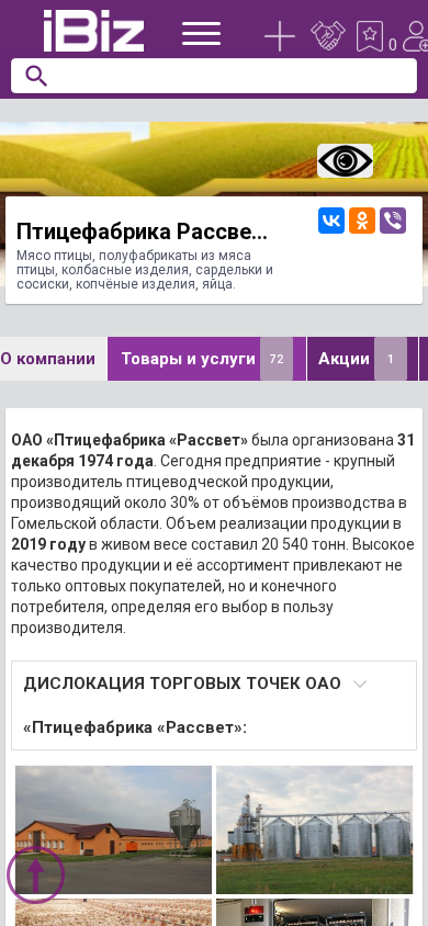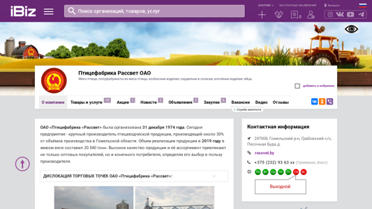 | AI-анализ | The web project "Птицефабрика Рассвет ОАО" is dedicated to the production and sale of poultry meat, semi-finished products, sausages, smoked products, and eggs. The company is located in the village of Песочная Буда, in the Gрабовsky district, Homiel region, Belarus. The contact information, including phone numbers and addresses of various sales points, is provided. The company was established on December 31, 1974, and today it is one of the major producers of poultry products in the Homiel region, accounting for approximately 30% of the total production in the area. In 2019, the total weight of the produced and sold poultry products amounted to 20,540 tons. The high quality and diverse product range attract both wholesale buyers and individual consumers |