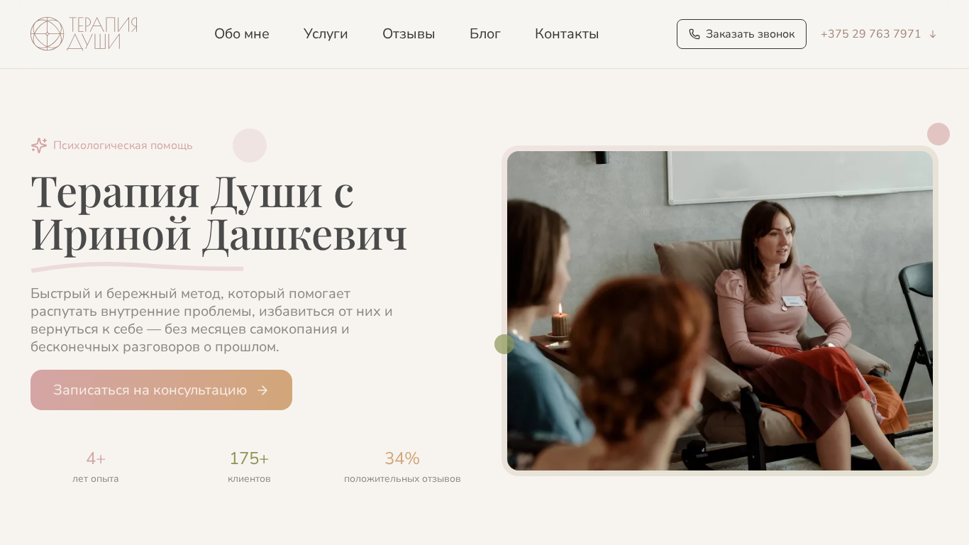 | SEO-описание | Психологическая помощь от частного психолога (терапевта души) в Минске и онлайн консультация в РФ, Беларуси, Европе и др. ➤ Специалист метода Терапия Души ➤ Более 12 лет опыта. |