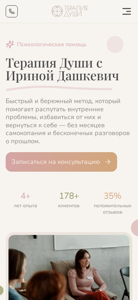 | AI-анализ | The portal dashkevich.by is a private psychology practice in Minsk, Belarus, offering in-person and online consultation services in Russia, Belarus, Europe, and other regions. The website's owner, Irina Dashkevich, is a psychologist and practitioner of the Therapy of the Soul method, with over 12 years of experience. She provides a quick and caring approach to help clients resolve inner issues and overcome them without lengthy self-reflection or endless discussions about the past. Clients can book a consultation and find testimonials on the site. Irina is a psychologist, Therapy of the Soul specialist, MAK-expert, and student of the II step of the Minisk Gestalt Institute, with an educational background in psychology and over 10 years of self-development in this field. She believes that everyone has the ability to heal |