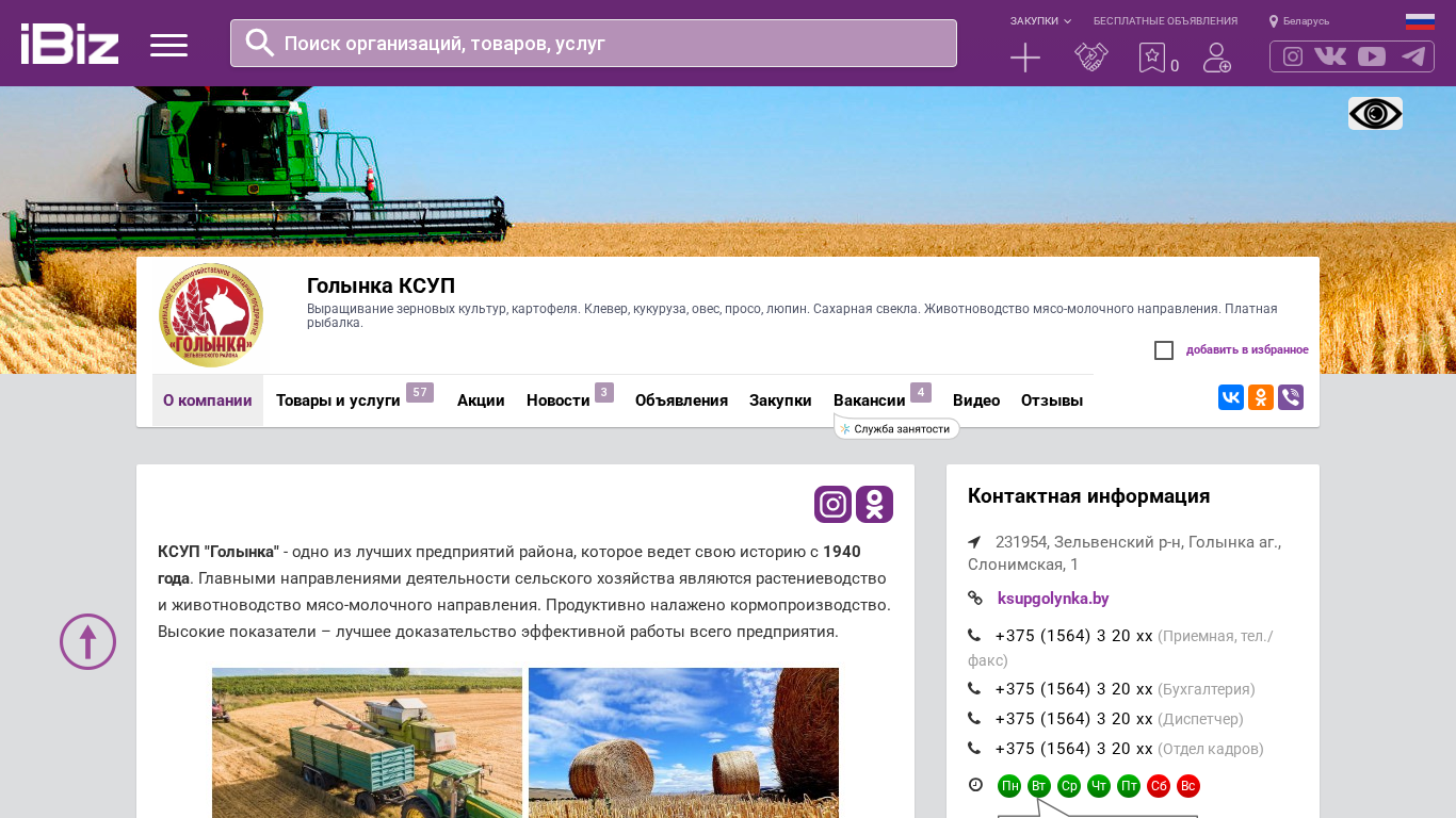 | AI-анализ | <!----> The website "Голынка КСУП" is a farming enterprise located in Belarus, producing grains, potatoes, clover, corn, oats, barley, flaxseed, sugar beet, milk from cows, beef, and offering fishing services for a fee. The business has been in operation since 1940 and its main areas of activity are agriculture and livestock farming with a dairy focus. The company owns 9187 ha of agricultural land, consisting of 5357 ha of arable land and 3061 ha of meadows. The enterprise comprises five dairy farms, a farm for raising and fattening young cattle, an auto park with specialized and agricultural machinery, and a grain drying complex. Alongside its main crops, the business grows clover, corn, oats, barley, and fl |