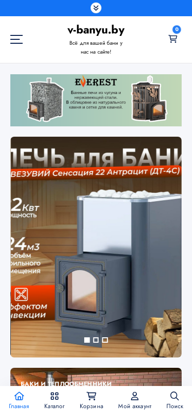 | AI-анализ | --- The web project "v-banyu.by" is an e-commerce website specializing in selling various items for saunas and bathhouses. The site's main sections include a shop, a cart, and an order placement page. The catalog offers droughty stoves for saunas under the brands "Эверест" and "Везувий," as well as Ethanol stoves, chimneys, materials for decorating saunas, and accessories. The site also features a catalog for electric stoves under the brand "KARINA," with a large assortment and low prices. Visitors can also find doors for saunas, baking and heat exchangers, and various elements for the sauna chimney. The site does not have any items in the cart at the moment. |
