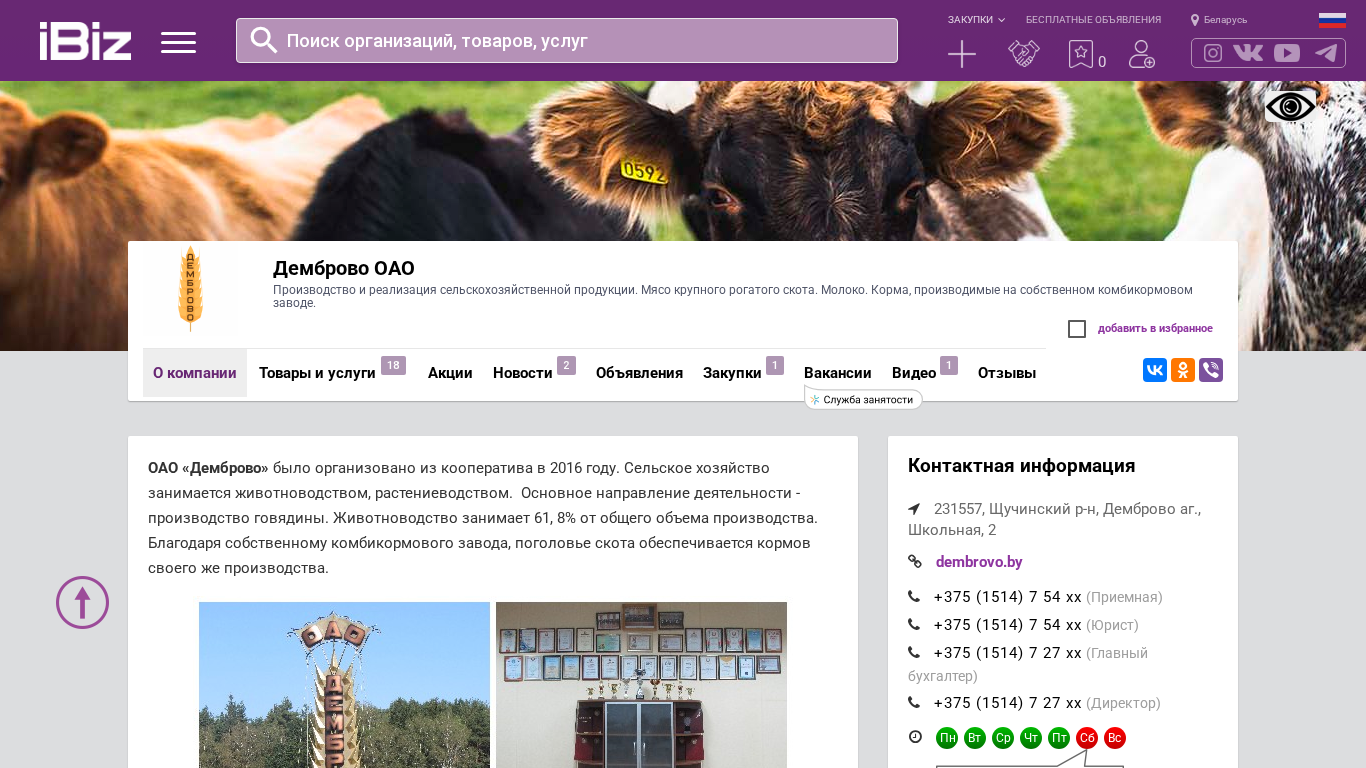 | AI-анализ | This website is for Dembrovo OAO, a Belarusian agricultural organization that produces and sells agricultural products. The main offerings are meat from large cattle, milk, and feed produced on their own combinator feed mill. The website includes a map for directions, contact phone numbers, and the address of Dembrovo OAO. The company was formed from a cooperative in 2016 and focuses on cattle farming, accounting for 61.8% of their total production. Their self-sufficiency in feed production is attributed to their own combinator feed mill. Dembrovo OAO offers and sells: meat from cattle; feed; agricultural products such as grains, sugar beets, and oilseed rape; and dairy products. The company consists of 4 tractor-agricultural brigades, 4 MTFs, and a complex for fattening large |