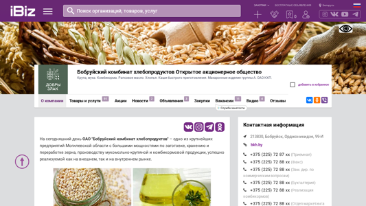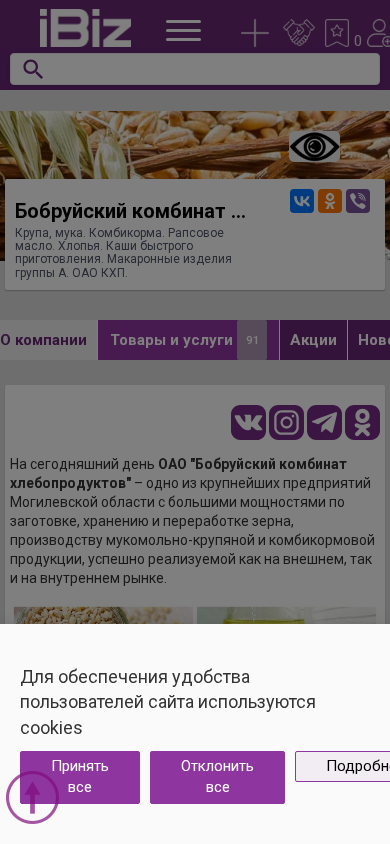 AI-анализ | The website is for "Бобруйский комбинат хлебопродуктов Открытое акционерное общество" (Bobruisk Bread Combine Open Joint Stock Company), a significant enterprise in Mogilev Oblast, Belarus, specializing in the production and sale of various grains and grain-related products, including flour, cereals, and feed. The company has separate production units, such as the Osipovich Production Site and the "Maslishny Kray" Production Site. Their main product lines include: granulated and pelleted animal feed for cattle, swine, poultry (broilers, piglets, layer chickens); rapeseed oil and meal; extruded cereals; various types of flour (wheat, rye, oats); grains; quick-cooking porridge; and mac |