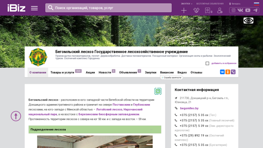 | AI-анализ | meta: The website is for a state forestry enterprise, Belomgles, located in the southwest of Vitsebsk region, bordering with Pospelovsky and Gulboksky forestries, Min region's Lohisky forestry, Narachansky National Park, and Brest region's Beryozinsky Biosphere Reserve. It covers an area of 50 km by 59 km. The website offers information on the production of timber products, pellets, woodworking, delivery of timber products, sale of seedlings and saplings, as well as organization of hunting, fishing, ecological tourism, and a hunting complex in Gorodenka. The contacts of two forestry subdivisions, Belomgelskie and Berezkovskoe lesnichestva, are provided, along with their phone numbers. |