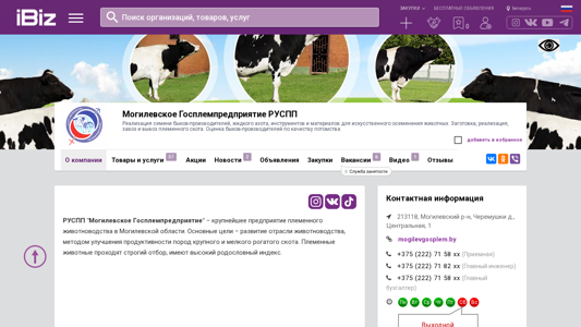 | AI-анализ | This online resource is a state farming enterprise called Могилевское Госплемпредприятие РУСПП, which specializes in the sale of semen from high-quality bulls, liquid nitrogen, tools, and materials for artificial insemination of animals. The enterprise also deals with the procurement, sale, import, and export of livestock. Bulls are evaluated based on the quality of their offspring. The website provides information about the company's location in Mogilev, Belarus, at the address 213118, Centralnaia St, Cheremuki d., and includes contacts for inquiries. The company offers a range of products and services related to agriculture and livestock farming. |