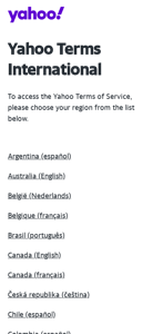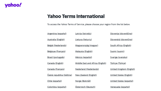 | AI-анализ | The web project "Yahoo Terms International | Yahoo" is a legal website that offers access to the Yahoo Terms of Service in various languages. Users can choose their preferred language from a list that includes Argentine Spanish, Australian English, Belgian Dutch and French, Brazilian Portuguese, Canadian English and French, Czech, Chilean Spanish, Colombian Spanish, Danish, German, Estonian, Spanish, Spanish, United States Spanish, French, Croatian, Indian English, Indonesian English, Irish English, Italian, Latvian, Lithuanian, Hungarian, Malaysian English, Mexican Spanish, Middle Eastern and African English, Dutch, New Zealand English, Norwegian, Austrian German, Peruvian Spanish, Philippine English, Polish, Portuguese, Quebec French, Romanian, Swiss German and French, Swiss Italian, Singapore English, Japanese, Slovenian, Slovak, South African English, Finnish, |