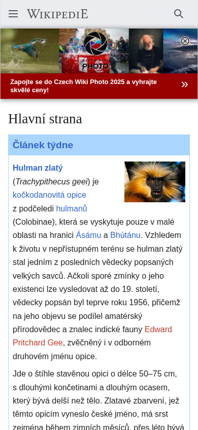 | AI-анализ | This online resource is the Czech version of Wikipedie, an open encyclopedia. The title is "Wikipedie, otevřená encyklopedie" and the description includes the phrases "open encyclopedia" and "everyone can edit". The keywords include "Wikipedia", "Wikimedia", "encyclopedia", "Czech", "open", and "edit". The top words are "dal", "nky", "hlavn", "wikipedii", "nobelovu cenu", "str", "kter", "jna", "wikipedie", "strana", "pod", and "wiki". The site contains 578,278 articles and has a wide range of topics, from scientific discoveries like the Hulman zlatý, a golden langur, to general knowledge |