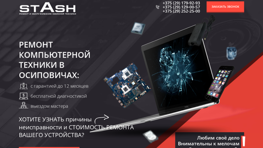 | SEO-описание | Сервисный центр STASH осуществляет ремонт компьютерной техники в Осиповичах. Ремонтные работы проводятся в нашей мастерской и в кратчайшие сроки. Ремонт устройств любых производителей. |