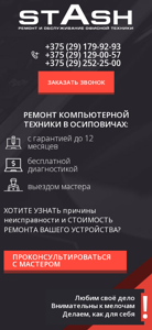 | AI-анализ | --- The web project "Repair of computers and laptops in Oshipovichy" (stash.by) is an online presence for a computer repair service center located in Oshipovichy, Belarus. The site offers repair services for all computer and laptop brands, and the repair works are conducted in-house and completed in the shortest time possible. The site contains a list of common issues that users might face with their devices, such as slow Windows performance, virus infections, and damaged screens. Users can contact the service center via three phone numbers for consultation and to schedule a repair. The site's content is primarily focused on repair services, with keywords related to computer repair, diagnostics, and troubleshooting. The top words on the site include "заказать" (to order), "руб" (ruble), "ремонт" (repair), "меня |