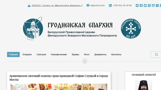 | AI-анализ | The portal is the official website of the Grodno Eparchy of the Belarusian Orthodox Church (Belarusian Exarchate of the Moscow Patriarchate). The eparchy's center is located in the city of Grodno. The territory of the eparchy covers the western part of Grodnen Oblast, including the regions of Grodno, Brestovitsa, Volkovysk, Zhelvon, Mostov, Svislach, and Щucyn, as well as parts of the Voronovo region. The website features news, photos, and documents related to the eparchy, including reports on the consecration of churches and the activities of the clergy. Archive of past news is available. The eparchy's archbishop, Antony, has recently consecrated a church of the Righteous Sophia of Slutsk in the |