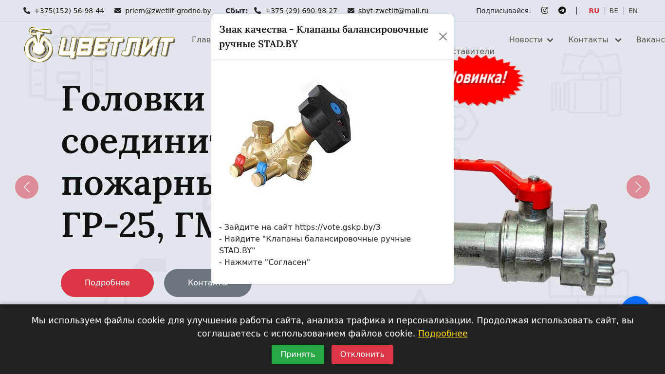 | AI-анализ | The website is for the Belarusian company "УП «Цветлит»," specializing in the production of piping fittings and valves. The site uses cookies for site improvement, traffic analysis, and personalization. The main sections include "Home," "Sales," "About Us," "Media," "Products," and "Contacts." The products consist of various types of valves and fittings for water supply, gas supply, heating, and fire safety systems. The company has been in operation for over 60 years and is the largest Belarusian producer of piping components for these applications. Contact information is provided for sales inquiries and product orders. |