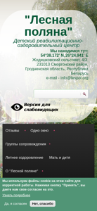 | AI-анализ | The portal "Лесная поляна" is a children's rehabilitation and health resort located in Smorgońsky district, Grodnen oblast, Belarus. The website provides information for visitors about the sanatorium, including its coordinates (54°38.172' N, 26°24.941' E), address (4/3, Joдишkovsky сельсовет, 231013), and contact email (info@lespol.org). The website features sections on the daily regime, nutrition for parents and children, life in the center, education, rest, excursions, rules and traditions, useful tips for parents and children, pedagogical staff, documentation, organization of educational process, and practical information. It also offers medical services, with various medical profiles and procedures, as well as prices for these services |