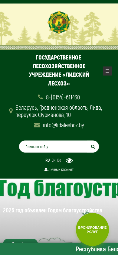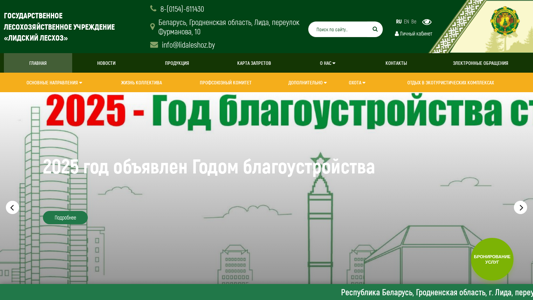 | AI-анализ | This online resource belongs to the state forestry enterprise "Lidsky Leshoz" located in Belarus, Grodненskaya oblast, city of Lida, Furmanov Pereulok, 10. The website provides information on the organization's structure, news, products, forest management, protection and conservation of forests, forestry staff, and rental of forest land plots. Additionally, it includes sections on hunting services, recreation in eco-tourist complexes, certification, and administrative procedures. The website is operated under the Ministry of Forestry of the Republic of Belarus, and includes various articles on forest safety, ecological tourism, and forestry news. The year 2025 has been declared as the Year of Improvement, and sections on youth, eco-tourism in the "Garny" Park, and a forest cottage are also featured |