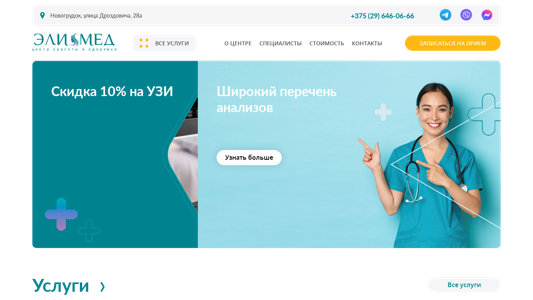 | AI-анализ | The title of this website is "Медицинский центр в Новогrudke ЭлизМед" (Medical center in Novogrudke ElizMed). The description mentions various medical specialties offered at the center, including urology, nephrology, cardiology, neurology, analysis, gynecology, endocrinology, and cosmetology. The center's address is given as Novogrudk, Ulitsa Drozdoвича, 28a, and the contact number is +375 (29) 646-06-66. The website offers various medical services, including ultrasound diagnostics (UZI), analysis, and specialized medical care in urology, nephrology, cardiology, neurology, gynecology, endocrinology, and cos |