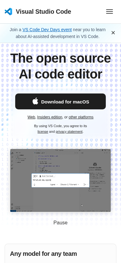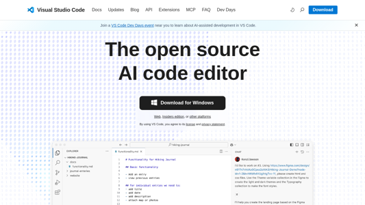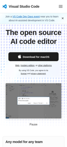 | AI-анализ | type: website This online resource, titled "Visual Studio Code - Code Editing. Redefined," is a website that provides information about Visual Studio Code, an open-source AI-powered code editor developed by Microsoft. The website introduces Visual Studio Code as a tool for building and debugging modern web and cloud applications, with a focus on its AI-powered feature, GitHub Copilot. The editor is available for free on Linux, macOS, and Windows platforms. The website includes links to download Visual Studio Code for various operating systems, as well as resources such as the Visual Studio Code Docs Updates Blog API Extensions MCP FAQ, and Search. Users can also join a VS Code Dev Days event to learn about AI-assisted development in VS Code. The website explains that users can use AI models like Claude Sonnet, or bring their own key to access models from various providers such as Azure, |