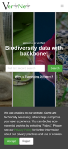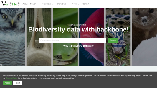 | AI-анализ | This online resource, VertNet, is a comprehensive database for vertebrate biodiversity information. It is a network that connects individuals, organizations, and institutions to explore, study, and share data on vertebrate species globally. The website offers various tools for data discovery, including searching, browsing, and filtering occurrences and datasets. The platform hosts over 666 datasets and 25 million occurrences, making it an essential resource for researchers, conservationists, and anyone interested in vertebrate species. The website also provides literature resources and georeferencing datasets, tools, and code for further analysis. Users can access and share data under various Creative Commons licenses, with contributions coming from a wide range of publishers. The homepage showcases various examples of vertebrate species, each with a brief description and the location and name of the observer. |