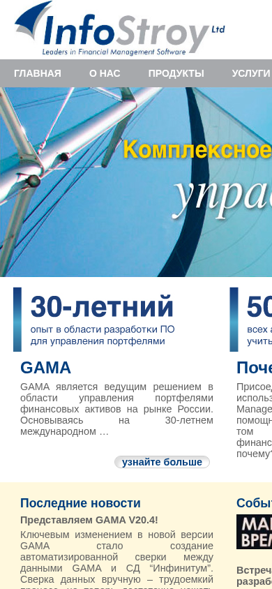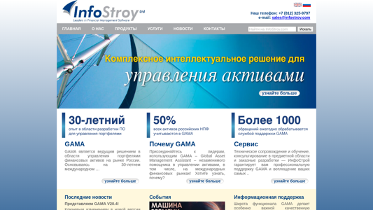 | AI-анализ | The website "Infostroy.ru" is the homepage of Infostroy, a company offering various services in the financial sector. The title is "Главная - Инфострой" (Main Page - Infostroy). The description is blank, but the keywords include 'infoistry', 'узнайте больше' (learn more), and 'GAMA'. The top words indicate that the website features news, products, services, technical support, consulting, training, custom developments, and contacts. The company, GAMA, is described as a leading solution for asset management on the Russian financial market, with a 30-year international background. The homepage includes a phone number and email address for sales inquiries. The website also mentions GAMA V20.4, an updated version with automated data verification between GAMA and a depositary called "Инфинитум". The home |